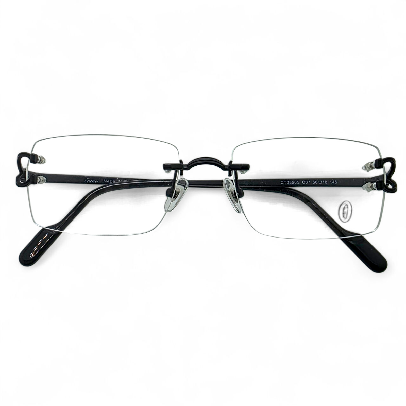 • Design: Rimless rectangular frame with Cartier’s iconic “C” temple detailing