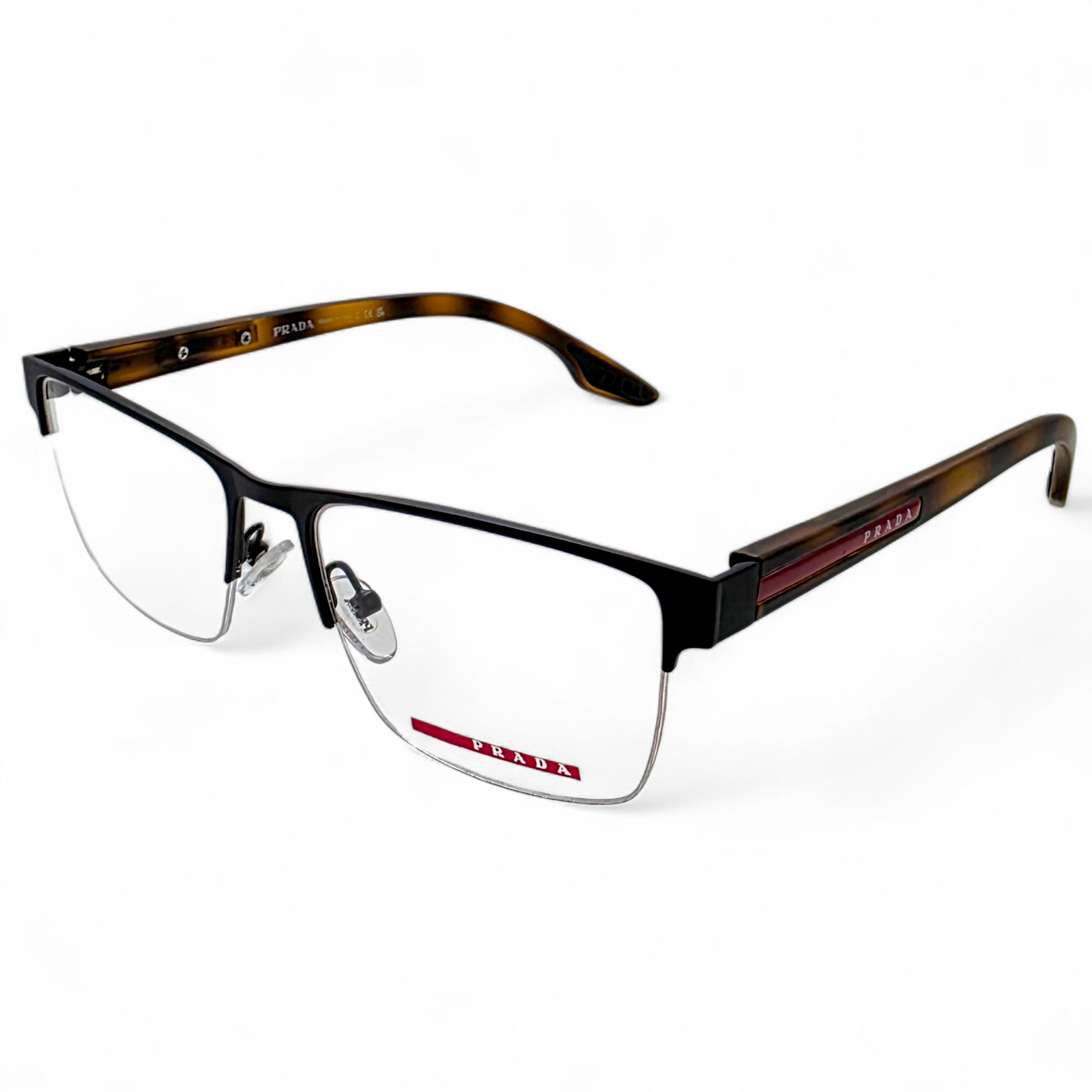 The Prada Half rimless eyeglasses, VPS04NA reflect the brand’s precision design and modern sophistication. Crafted for those who value refined minimalism, this semi-rimless frame combines black metal on the upper front with a half rimless design, creating a clean, structured look.