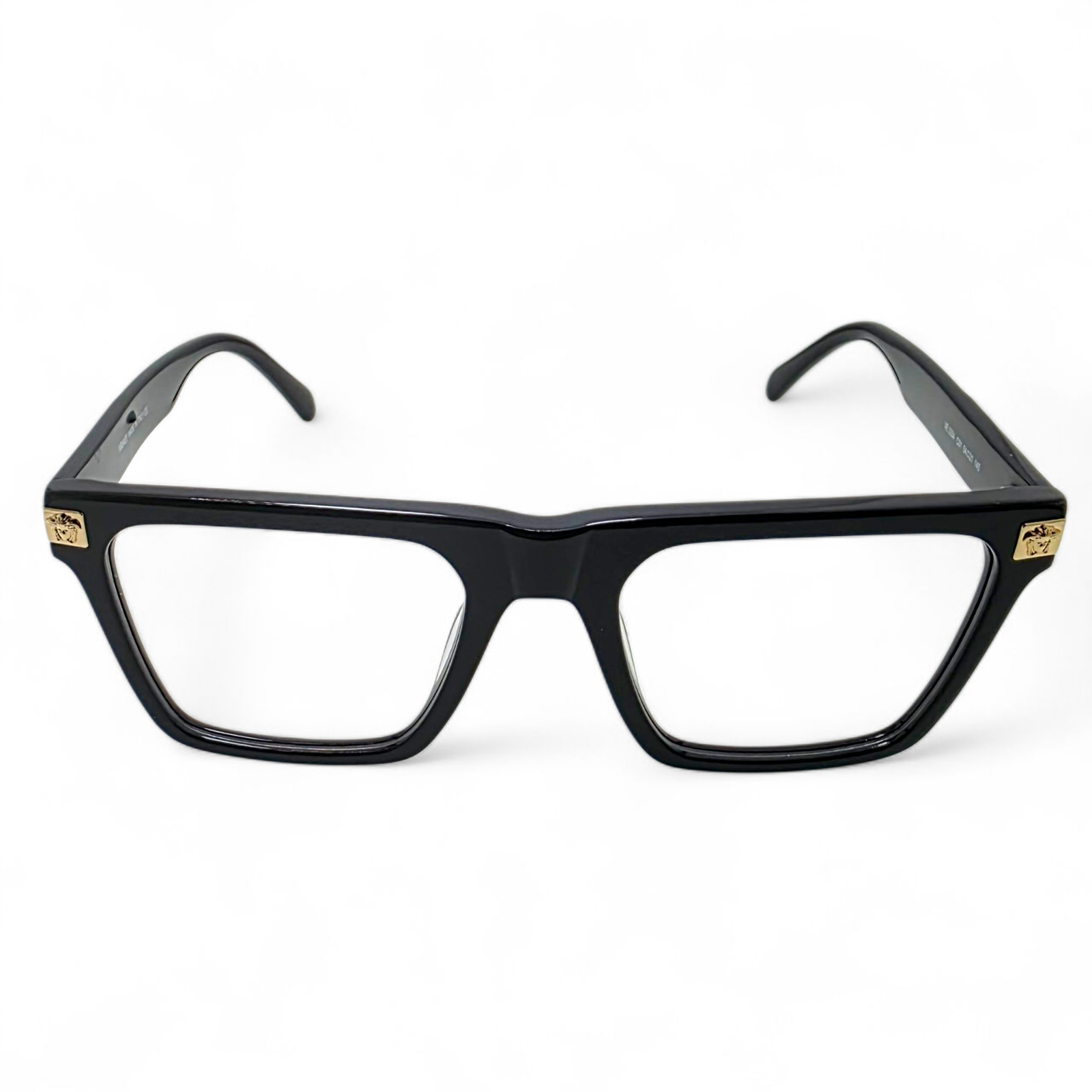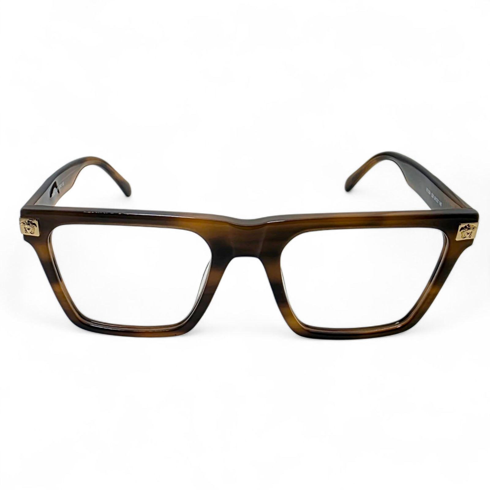 The VE3354 features a rectangular silhouette with clean, defined lines and a substantial acetate structure that offers both presence and comfort. Each temple is adorned with Versace’s signature Medusa emblem in gold, adding an unmistakable touch of opulence.